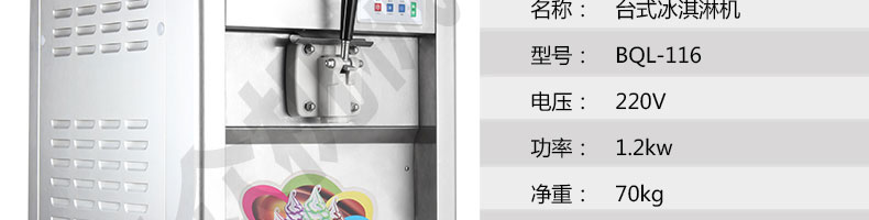BQL-116臺式冰淇淋機,●選用國際名牌成熟制冷配套件和高效壓縮機,融合旭眾精湛工藝輔以嚴格的質量控制流程,使產品整體性能及品質得以全面提升?!癫捎萌珨底蛛娔X控制系統(tǒng),選用名牌優(yōu)質電器元件,先進的生產工藝,故障診斷,軟硬任意調制,自動修復功能,安全精確,可靠性更高?!駥I(yè)成熟制冷系統(tǒng)設計,選用世界名牌大功率專用壓縮機,大大縮短冰淇淋成型時間,相同時間內冰淇淋產量大幅度增加,使您生意火爆時依然得心應手,為您創(chuàng)造財富?!癜踩椒€(wěn)的機械攪拌系統(tǒng),噪音更低、振動更小,使整機運行性能達到國際先進水平?!翊_保進料溫度在0°C~35°C;環(huán)境溫度5°C~40°C勻可正常使用。