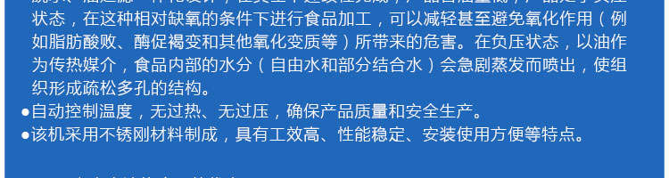 zk-1200雙罐低溫真空油炸機,適用于水果類、蔬菜類、干果類、水產品機畜禽肉類等。油炸食品不易褪色、褐色,可以保持原料本身的顏色