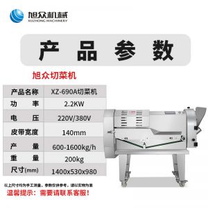 XZ-690A型多功能切菜機(jī),工作效率高,幫你省人工費(fèi)。1小時(shí)可切600kg-1600kg/h,1臺機(jī)器等于多名廚師同時(shí)為您工作。一機(jī)多用,可切瓜果、蔬菜、藥材,刀片可進(jìn)行更換,設(shè)計(jì)周到,結(jié)構(gòu)合理,簡單輕松應(yīng)對。